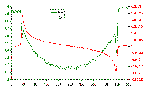 The apparent absorption and apparent refraction images are shown above. On the left the graph shows vertical sections through these images which illustrate the separation into refraction and absorption effects. Vertical sections through the apparent absorption (green) and apparent refraction (red) angle plastic rod images shown above. The edge effects visible in the apparent absorption image are probably residual phase contrast effects.