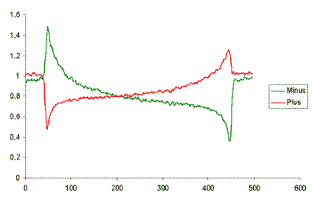 That this is correct can be seen intuitively from the graph on the left. This shows vertical sections taken through the high and low angle plastic rod images. It can be seen that by adding these together, the edge effects cancel out and one is left with just the arc representing the absorption effects . We call this the apparent absorption image (see below) The subtraction of the images removes the arc of the absorption but adds the opposite signed edge effects resulting in an apparent refraction image (see below)  |  | Apparent absorption image | Apparent refraction image |