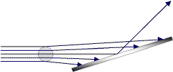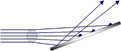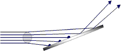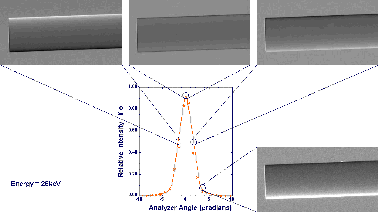 The experimental technique relies upon the very small range of angles over which a perfect crystal reflects X-rays. For the most commonly used cut of silicon crystal, this angular range is approximately 3 micro radians. To put it another way, this is the same angle subtended by an object 3mm high when seen from a kilometre away! Put more technically, the analyser reflectivity varies strongly with angle. It is close to unity at the Bragg angle qB and has a rocking curve width, DqD, of ~3mRadians. The analyser therefore functions as an extremely narrow slit. If the analyser angle is set half way down the rocking curve (qB±DqD/2), then its reflectivity is 0.5 for X-rays that transit the object undeviated. Rays that are deviated in the object through small angles will be reflected with either a greater or lower efficiency depending on the angle of incidence relative to the rocking curve. The steep slope of the rocking curve acts as a contrast amplifier and the technique is sensitive enough to reveal X-ray refraction effects which carry different information to conventional absorption contrast images. The series of diagrams and images in the table below explain this in a pictorial way. The images are of a simple plastic (pmma) rod with a diameter of 4mm seen from the side. Low angle image | Peak Reflectivity | High angle image |  |  |  | Here the analyzer is set at the low angle 50% reflectivity point of the rocking curve for those rays that pass through the object undeviated. Any rays that are deviated by the object to an angle which is closer to the peak reflecting angle will be reflected with greater than 50% efficiency. The image below shows this for the rays refracted from the top of the plastic rod as illustrated in the diagram above. Conversely any rays that are deviated by the object to an angle which is further away from the peak reflecting angle will be reflected with less efficiency. This what is happening at the bottom of the plastic rod in the image below. | Here the analyzer is set at the peak of the rocking curve for those rays that pass through the object undeviated and reflects the X-rays with close to 100% efficiency. | Here the analyzer is set at the high angle 50% reflectivity point of the rocking curve for those rays that pass through the object undeviated. This is a similar situation to that illustrated in the first column of this table except that the analyzer is set to the opposite side of the rocking curve. In this case the gradient of reflectivity with angle is the reverse of the first column and so now the top of the plastic rod is deviating rays further away from the peak reflecting angle and so it appears dark in the image. Ray from the bottom of the rod are deviated to an angle which is closer to the peak reflecting angle and so it appears bright. |  | | The graph above shows the variation of reflectivity with angle. This graph is known as the rocking curve | The image above was recorded with the analyzer set to about 5% reflectivity. The contrast enhancing effect of the crystal is very strong here but fewer X-rays get to the detector resulting in a grainy image |